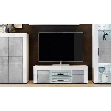 Elegantno in sodobno televizijsko stojalo z belimi vrati in cementnim zaključkom. Dolg 138 cm, kot nalašč za stilsko opremljanje dnevne sobe.