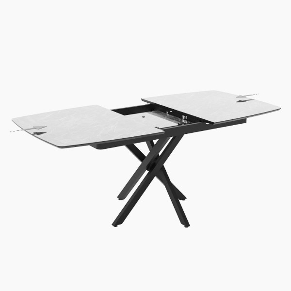 Vrtljiva in raztegljiva miza z mat belo keramično ploščo z učinkom marmorja. Sodobna in funkcionalna zasnova, kot nalašč za elegantna okolja. Mere 140x90x76H cm.