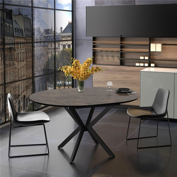 Raztegljiva vrtljiva miza s keramično ploščo iz mat črnega marmorja. Sodobna, funkcionalna in prefinjena zasnova. Idealna za elegantne in sodobne dnevne sobe.