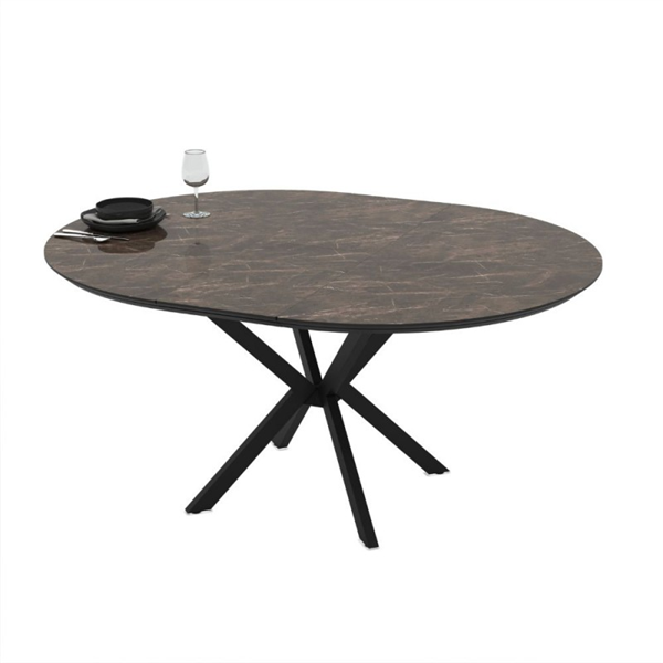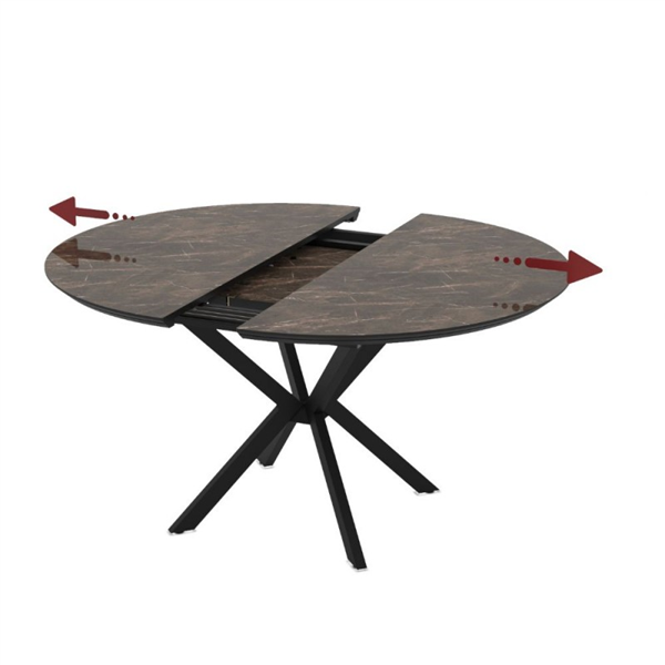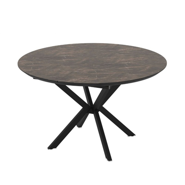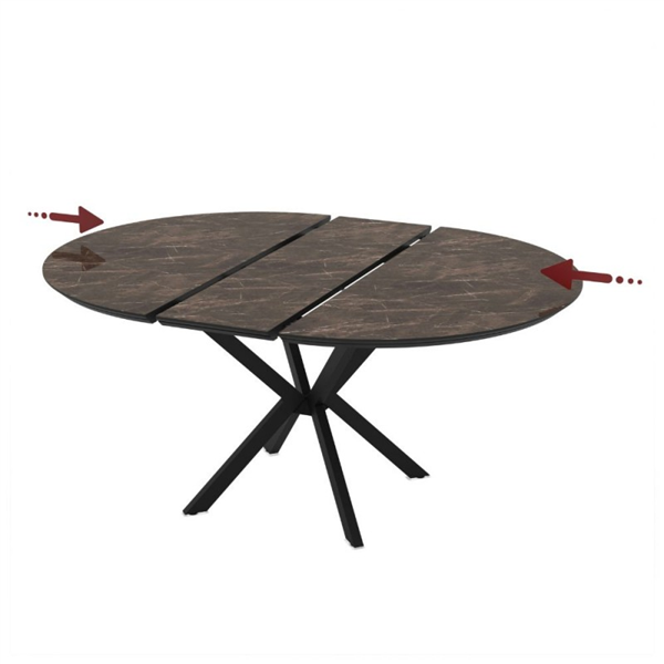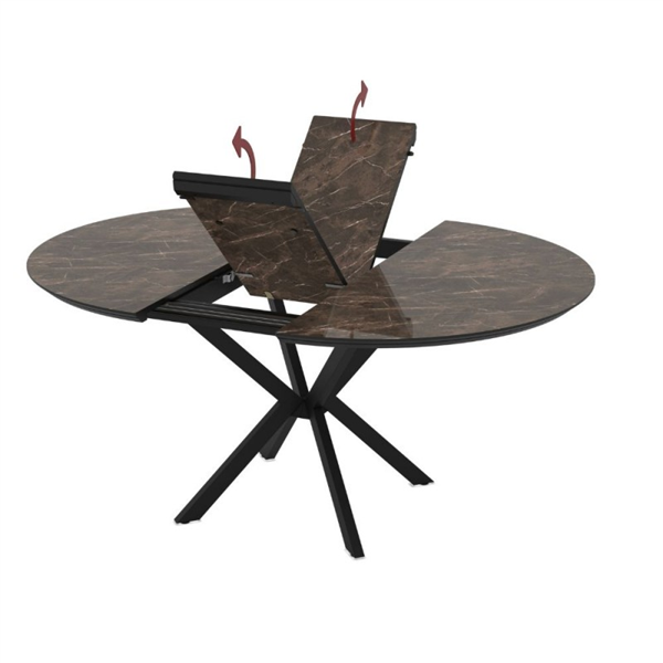 Raztegljiva okrogla miza Bagok, sijajna rjava površina z učinkom marmorja, elegantne črne noge. Premer 126 cm, kot nalašč za moderna in prefinjena okolja.