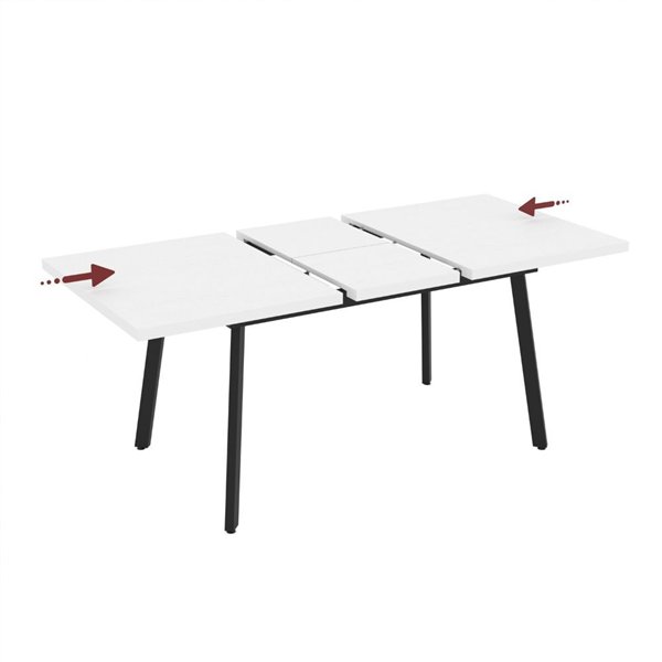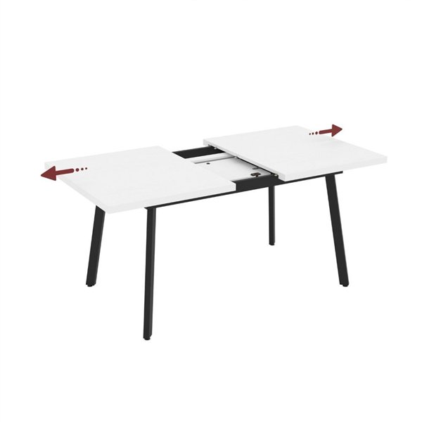 Raztegljiva miza s sodobno zasnovo, sijajno belo površino in črnimi kovinskimi nogami. Dimenzije 138x85 cm, kot nalašč za sodobna okolja.