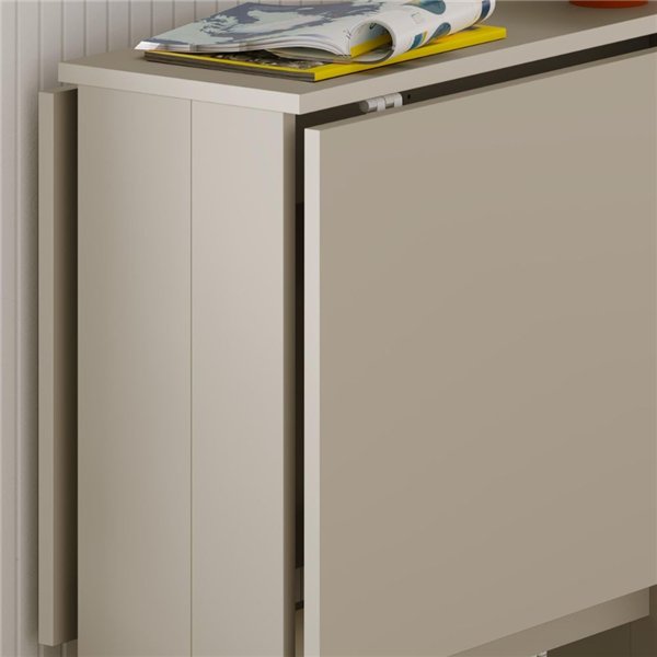 Zaprta je popolna konzolna mizica za varčevanje s prostorom, ki jo lahko postavite v predprostor ali dnevno sobo.