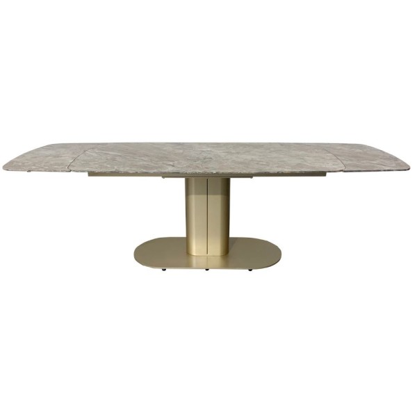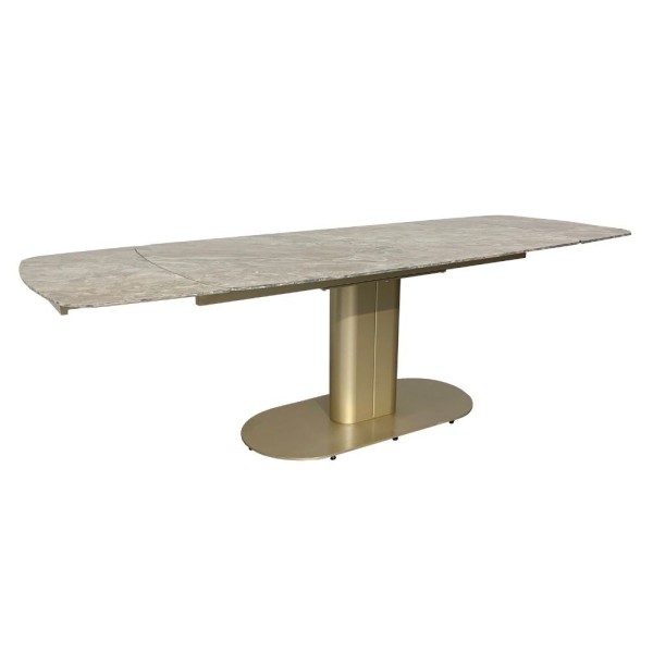 Raztegljiva miza Vesta je eleganten dodatek vašemu bivalnemu prostoru. Bleščeča rjava keramična plošča ponuja pridih prefinjenosti, zlata podloga pa dodaja pridih razkošja. Odlična je za prirejanje večerij s prijatelji in družino.