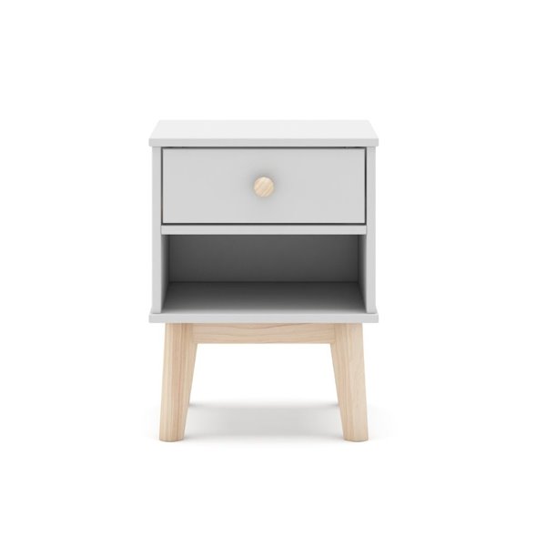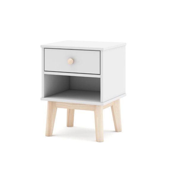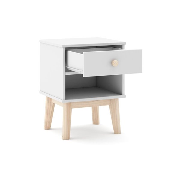 Nočna omarica iz masivnega lesa s predalom v beli barvi. Idealna za moderne in klasične spalnice. Kompaktne mere: 40x35x53H cm. Robustna, elegantna in funkcionalna.