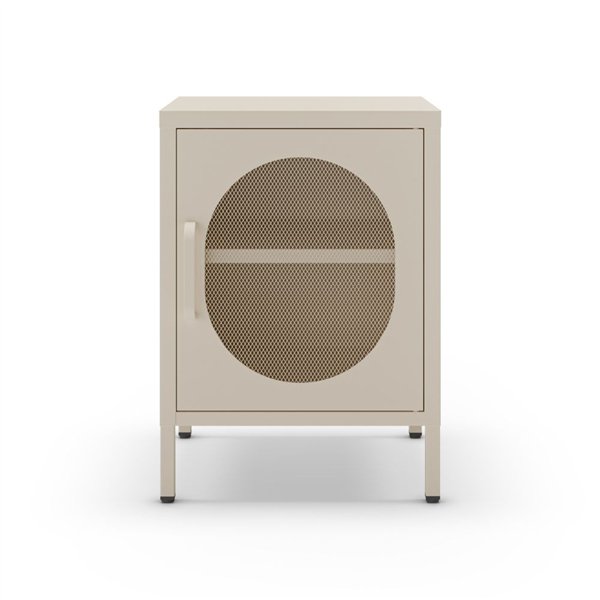 Kompaktna nočna omarica s predalom in dvema odprtima policama, peščena barva. Dimenzije 45x41x50 cm, idealna za moderne sobe in majhne prostore.