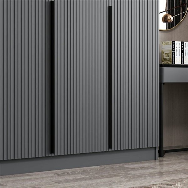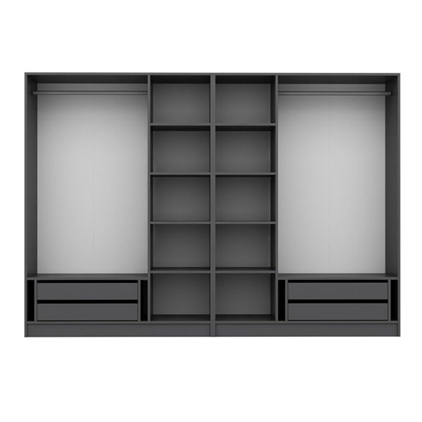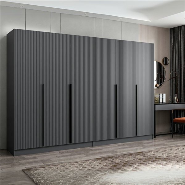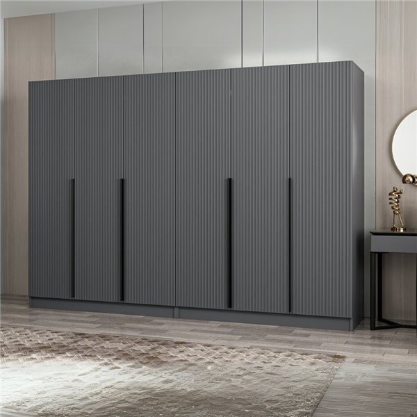 Sodobna garderobna omara s šestimi vrati na tečajih v antracitni izvedbi. Veliko notranjega prostora za shranjevanje oblačil in dodatkov. Idealna za elegantne in funkcionalne prostore.