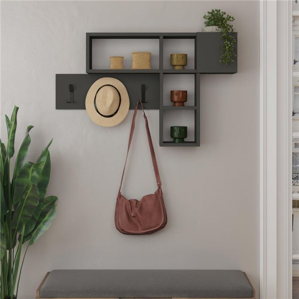 Stenski obešalnik Game, zasnovan za optimizacijo prostora, pritegne pozornost s svojo sodobno, minimalistično zasnovo in prefinjeno antracitno obdelavo, nevtralnim in elegantnim odtenkom, ki se zlahka prilega vsakemu pohištvenemu kontekstu, od najbolj klasičnega do najsodobnejšega.