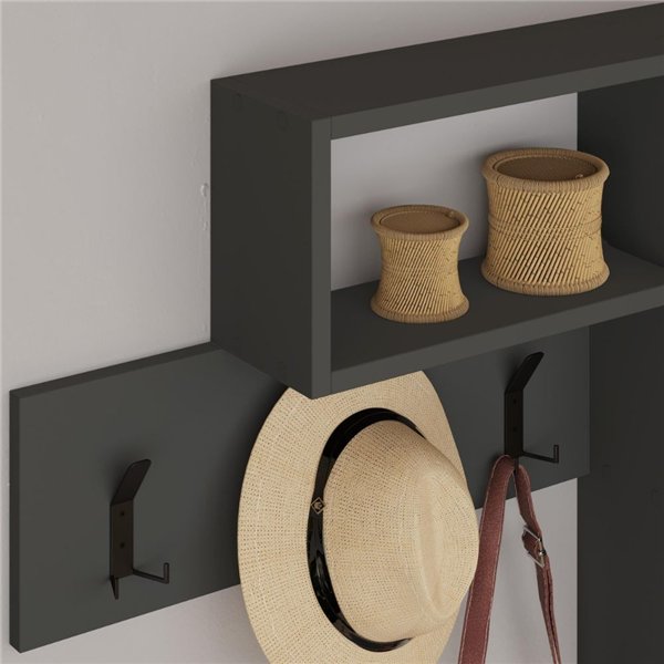 Opremljen je s 3 praktičnimi večnamenskimi kavlji (dvojnimi ali trojnimi), ki so kot nalašč za jakne, šale in torbe, ter kar 4 odprtimi predali, ki so idealni za shranjevanje ključev, denarnic, pošte ali za razstavljanje drobnih pohištvenih dodatkov, kot so vaze in okvirji za slike, s čimer vhod iz preprostega prehoda postane prava vizitka vašega doma.