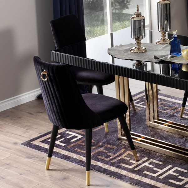 Jedilni stol Akustik Simphony iz črnega žameta. Eleganten in udoben, kot nalašč za sodobna in prefinjena okolja, idealen za jedilnice, dnevne sobe ali pogodbene prostore.