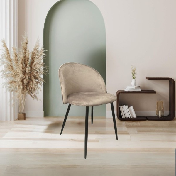 Eleganten stol z oblazinjenjem iz žameta taupé in črnimi kovinskimi nogami. Sodoben dizajn in kompaktne dimenzije za stilsko opremo vsakega prostora.