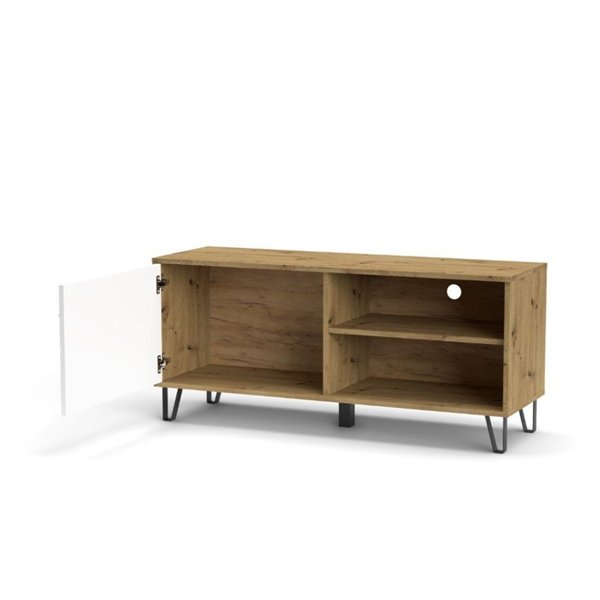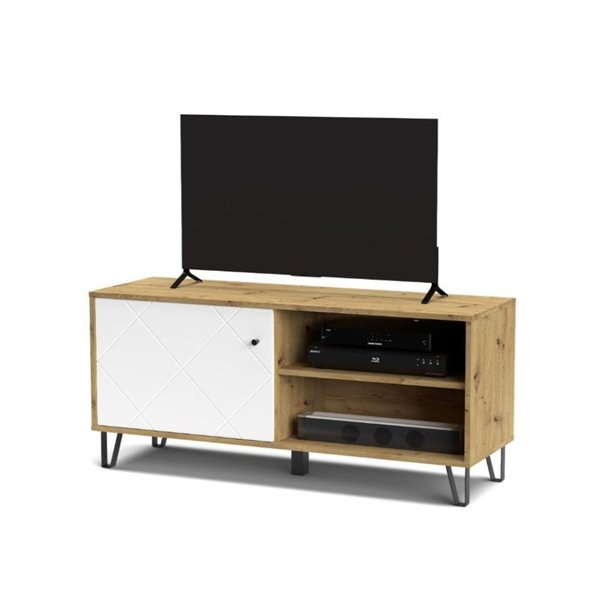 Stojalo za televizor s sodobno zasnovo, dvema vratoma in odprtim predalom za shranjevanje medijskih naprav. V hrastovi in beli barvi, kot nalašč za opremo dnevne sobe.